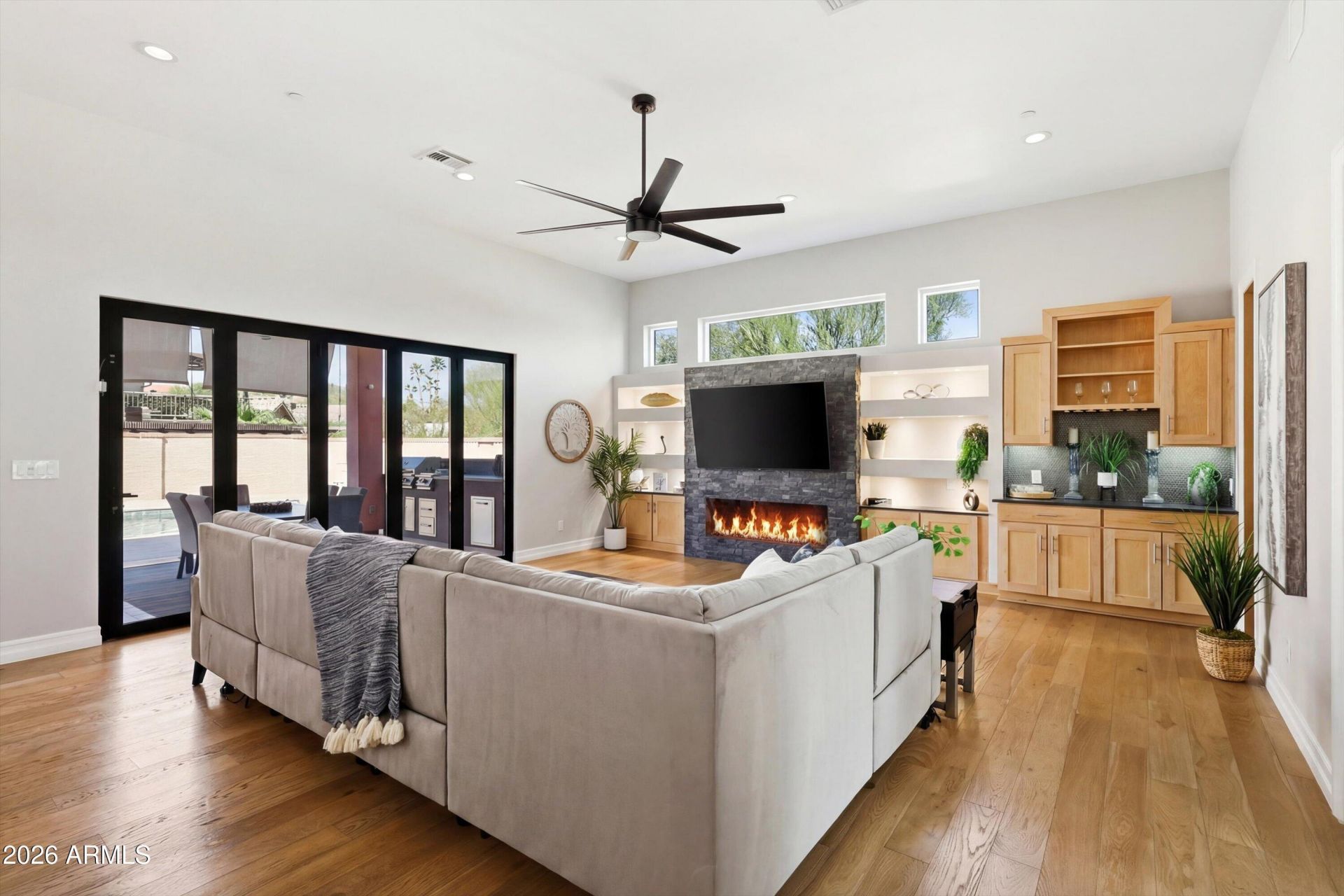 Modern desert luxury beautifully designed single-level home in the heart of Fountain Hills. Built in 2021, this 4bed/3bath residence offers nearly 2,500 square feet of thoughtfully curated living space w/breathtaking mnt views & seamless indoor-outdoor living. A stunning chefs kitchen featuring natural wood Shaker cabinetry, stainless Caf�© Series SS appliances, built-in refrigerator, electric cooktop, wall oven, oversized island, & walk-in pantry. The open great room showcases engineered hardwood flooring, a custom built-in entertainment center with electric fireplace, wet bar, and refrigerated wine room; perfect for entertaining or relaxing in style. Expansive 12ft folding glass patio doors open to a resort-style backyard complete with a heated PebbleTec pool, Baja shelf, water featur