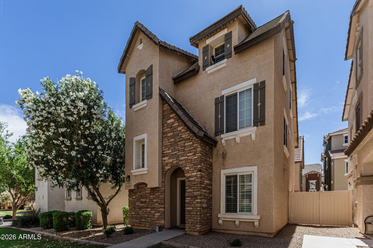 New roof approved and in process! A/C unit approx. 2 yrs old! DETACHED townhome in The Gardens, one of Gilberts premier neighborhoods! Recent interior paint! Wood flooring! Features include: main level family/bonus room with 1/2 bath; second level opens to living/dining space & kitchen with granite countertops, breakfast bar, SS appliances, pantry, upgraded cabinetry. Secondary bedrooms with full hall bath also on second level. Primary suite encompasses entire top level and includes a reading or desk nook, large walk in closet, and ensuite bathroom. Plantation shutters, integrated surround sound, 2 car garage; soft water loop; interior laundry, washer/dryer, and ample storage. Well kept community offers exceptional amenities, including parks, 3 pools, basketball court & more! Hurry!