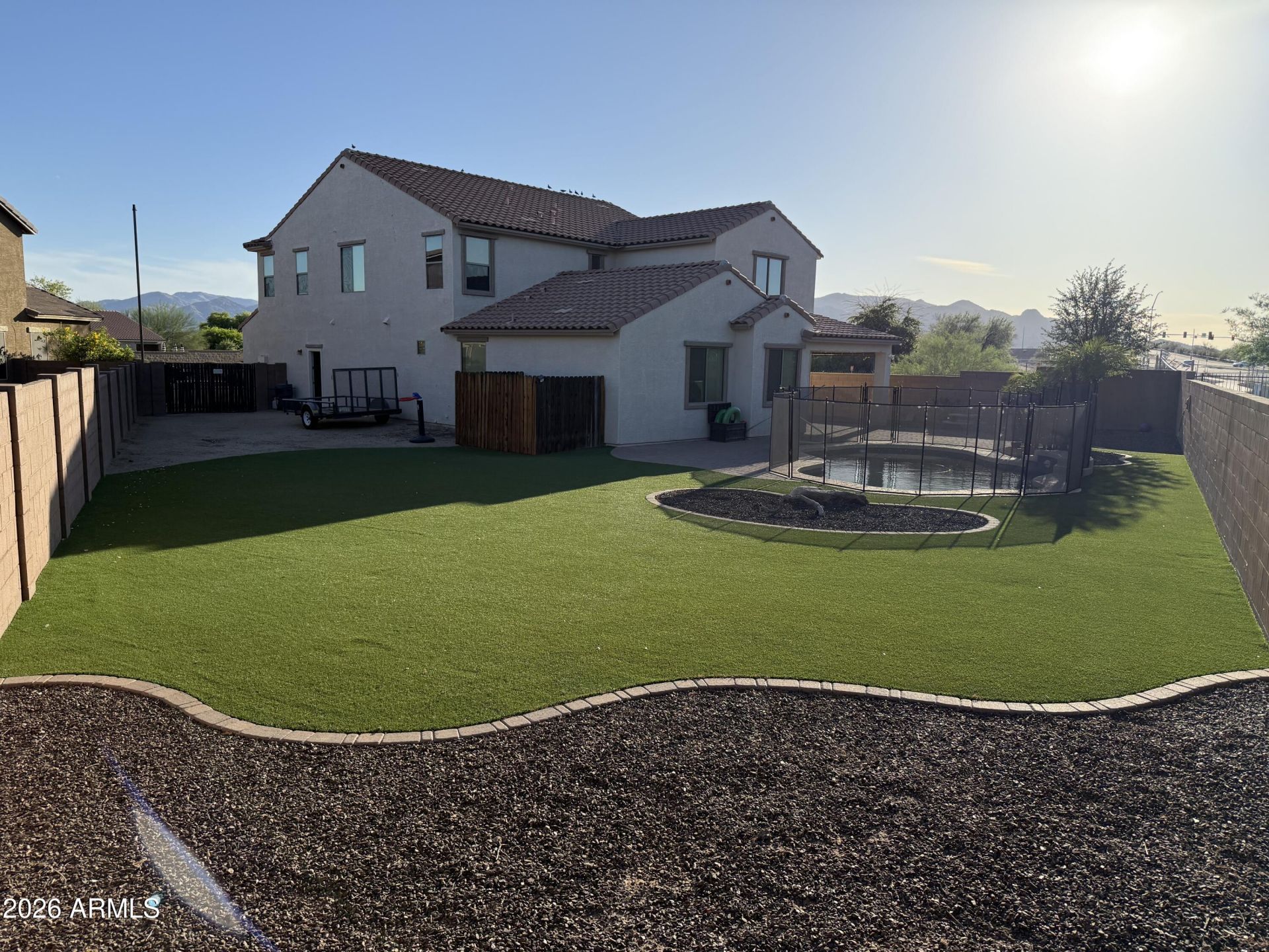 Nestled in a desirable cul-de-sac with stunning mountain views, this beautifully maintained home offers elegance and functionality. The main level features tile flooring, a private owners suite with dual vanities, soaking tub, separate shower, and walk-in closets, plus a den. The formal living area boasts vaulted ceilings, and the open kitchen includes granite countertops, large pantry, and breakfast nook overlooking the family room. Upstairs offers a loft, four bedrooms, Jack-and-Jill bath, full bath, and laundry. The backyard features a Pebble Tec pool with variable speed pump, pavers, turf, and RV gate, plus a huge side yard for your toys. Borders common area with ample parking for holiday guests. 3-car tandem garage with insulated door, 220V, some windows have tint, programmable thermostat, and radiant barrier roof for efficiency. Owner/Agent