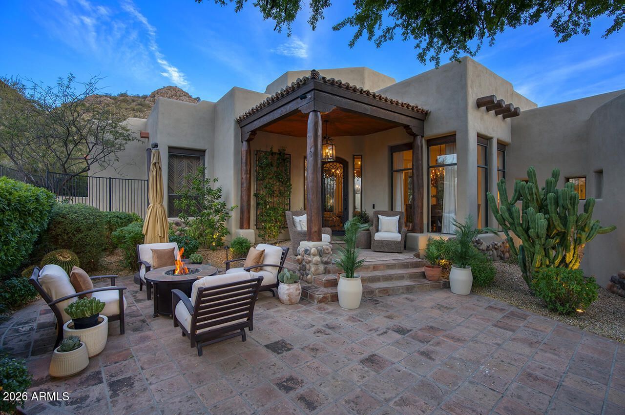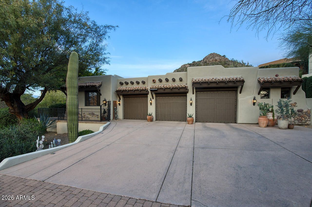 Tucked away on a private cul-de-sac in Troon Ridge Estates, this stunning custom residence blends timeless character with thoughtful design, creating a true desert retreat. Picturesque in setting and thoughtfully curated, the home showcases refined character with an effortless resort-style feel. A long, tree-lined driveway sets the tone, leading to a private courtyard entry framed by a custom-designed gate by Michael Jones, setting an immediate tone of craftsmanship and distinction.Outdoor living takes center stage, beginning with a charming front patio offering direct views of Troon Mountain and access to a private entry casita complete with its own bath and kitchenette--perfect for guests. The backyard unfolds as a resort-inspired escape, nestled against the McDowell Mountains, where expansive covered patios and accordion pocketing doors create a seamless indoor-outdoor experience.Designed for both relaxation and entertaining, the outdoor spaces feature dual fireplaces, creating multiple gathering areas, along with a large built-in barbecue and dedicated serving station with sink, making hosting effortless. A beautifully appointed dining area beneath a lit pergola sets the scene, while the pool with Baja shelf, separate spa, elevated lounge area, and integrated misting system enhance the overall comfort and resort-style experience. The covered ramada--complete with beamed and latilla ceilings, gas kiva fireplace, and built-in seating--offers a warm and welcoming setting.Rich in architectural detail, this well-executed residence showcases a floor plan with three bedrooms and a separate office, offering both flexibility and livability. A curated blend of stone, wood, and cantera is paired with artisan tile accents, creating a home layered with texture, warmth, and distinctive style. The eat-in kitchen features an 8-burner Viking gas cooktop, highlighted by a custom wood-designed range hood, granite countertops, and a butlers pantry with custom cabinetry extending to the ceiling. In the great room, stone and granite fireplace hearths and niches add depth and visual interest, while the office is enhanced by custom furniture-grade built-in bookcases.Beautifully appointed, the primary suite features a cantera fireplace and direct access to the covered patio and backyard beyond. The spa-like bath is complemented by two custom furniture-grade walk-in closets with chandeliers, creating a boutique-style dressing experience. A junior master suite/secondary bedroom offers its own distinctive design with upholstered wall detailing in a refined grid pattern with wood trim, adding a timeless, tailored aesthetic. The powder room is equally memorable, finished with unique leather wall treatments that further reflect the homes thoughtful design.Set within the highly desirable Troon Ridge Estates, this home offers a rare blend of privacy, natural beauty, and elevated desert living. Surrounded by the dramatic backdrop of Troon Mountain and the McDowell Mountains, and enriched by artistic design elements at every turn, this is a beautifully composed residence that captures the essence of a truly special home.