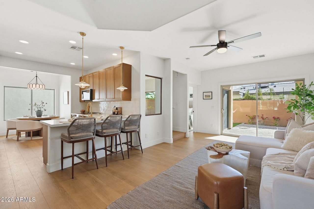 Located in Arcadia Lite, this beautifully updated 4 bed, 2.5 bath residence blends elevated design w/ effortless everyday livability. Custom cabinetry, brand new white cafe style appliances, & curated designer tile & fixtures set a refined tone throughout. The kitchen serves as a true centerpiece, balancing function & style w/ clean lines & premium finishes. Bathrooms feature unique vanities that add character & a polished, boutique inspired feel. Natural light fills the living spaces, creating a warm, inviting atmosphere. Step outside to a covered patio w/ pavers & a turf backyard, ideal for low-maintenance outdoor living. This stylish home is fully detached w/ no shared walls & sits within an exclusive 15-residence enclave. Residents enjoy gated access, a resort-style community pool, & a private two car garage, all set moments from premier dining, shopping, & entertainment.