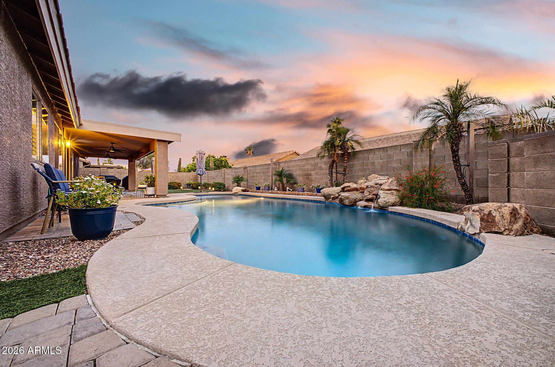 Welcome to this beautifully maintained home in sought-after Sierra Ranch, where thoughtful updates & inviting spaces create effortless comfort. Fresh interior & exterior paint (April 2025) enhance the homes curb appeal, complemented by a manicured front yard & charming entry. Inside, youll find soaring vaulted ceilings, plantation shutters, ceiling fans, sunscreens, & updated lighting throughout. The spacious living & dining areas feel bright and open--perfect for both everyday living & entertaining. The kitchen features stainless steel KitchenAid appliances, including a double oven range, along with a pantry for added storage. The primary suite offers a stylish barn door, walk-in closet, & a private toilet room for added convenience. Step outside to your private backyard oasis with... extended pavers, an RV gate, and no two-story homes behind for enhanced privacy. Enjoy the sparkling PebbleTec pool with waterfall, color-changing lights, and updated equipment--perfect for relaxing or entertaining year-round. Additional highlights include a well-appointed laundry room with added cabinetry and a garage with attic access for extra storage.Ideally located just minutes from the US-60, Loop 202, and SR-24, this home offers convenient access to top destinations including Revel Surf at Cannon Beach, Arizona Athletic Grounds, and Phoenix-Mesa Gateway Airport. Youll also enjoy close proximity to shopping, dining, and entertainment, with easy access to Phoenix Sky Harbor International Airport just a short drive away.